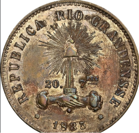 A peça rara foi emitida como teste para a unidade monetária nacional da República Riograndense. Sua raridade vem de sua antiguidade, estado de conservação e integridade, pois outras peças similares foram transformadas em botão gauchesco.